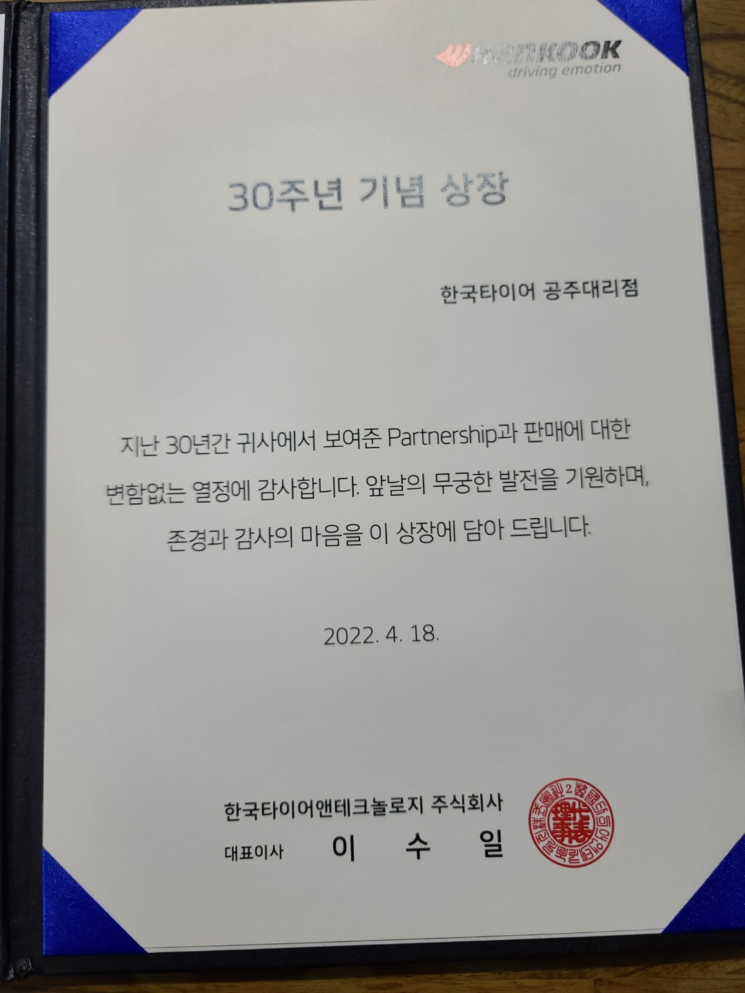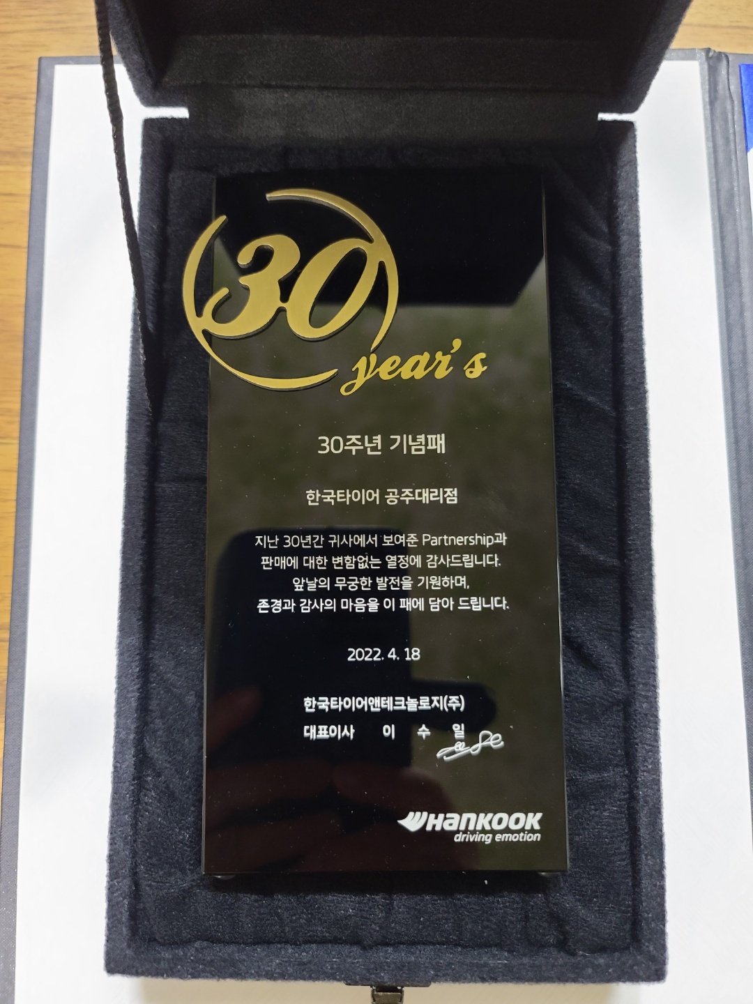 한국타이어 본사로 부터 30주년 기념패와 기념 상장을 받게 되었습니다.